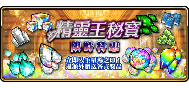 本次準備了包含魔晶石 20%額外增量、星導之印以及大量地之碎片的精靈獻禮禮包,以及魔晶石 20%額外增量、星導之印以及蒼空結晶的精靈祝福禮包等,立即入手專屬特典回饋!
