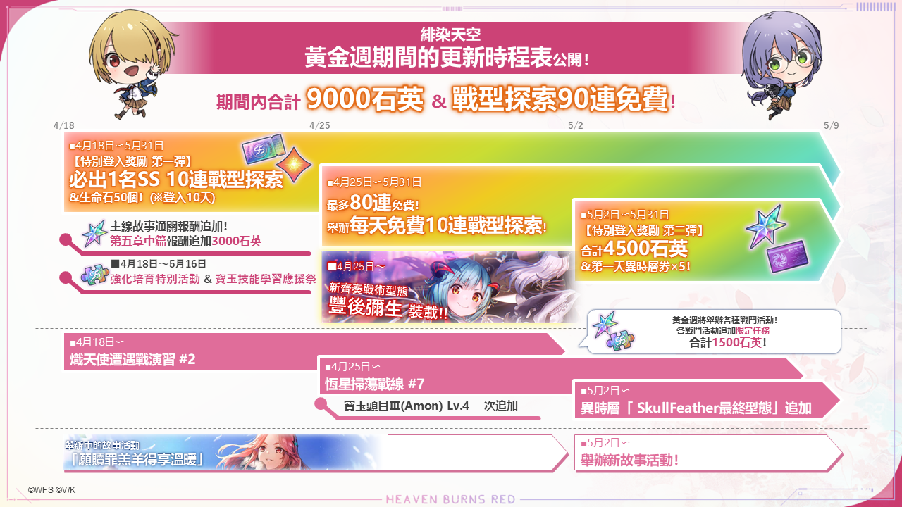 同時間舉辦新服裝 SS 天音/櫻庭登場的「精選白金戰型探索」!另,舉辦登入第一天即可獲得 3,000 個石英&異時層券×5,登入 16 天可獲得合計 4,500 個石英的「黃金週 特別登入獎勵 第二彈」!