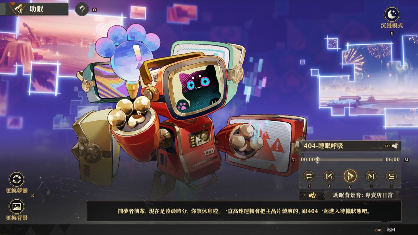 除了收集角色在本作還有特殊用途,遊戲還有一個名為「助眠」的系統,可以讓你換上喜歡的夢靈使用助眠背景音以及 ASMR 語音內容,通關劇情更可以取得豐富的背景圖,讓夢靈伴你入眠。遊戲很多 BGM 都有助眠效果,玩起來放鬆身心。