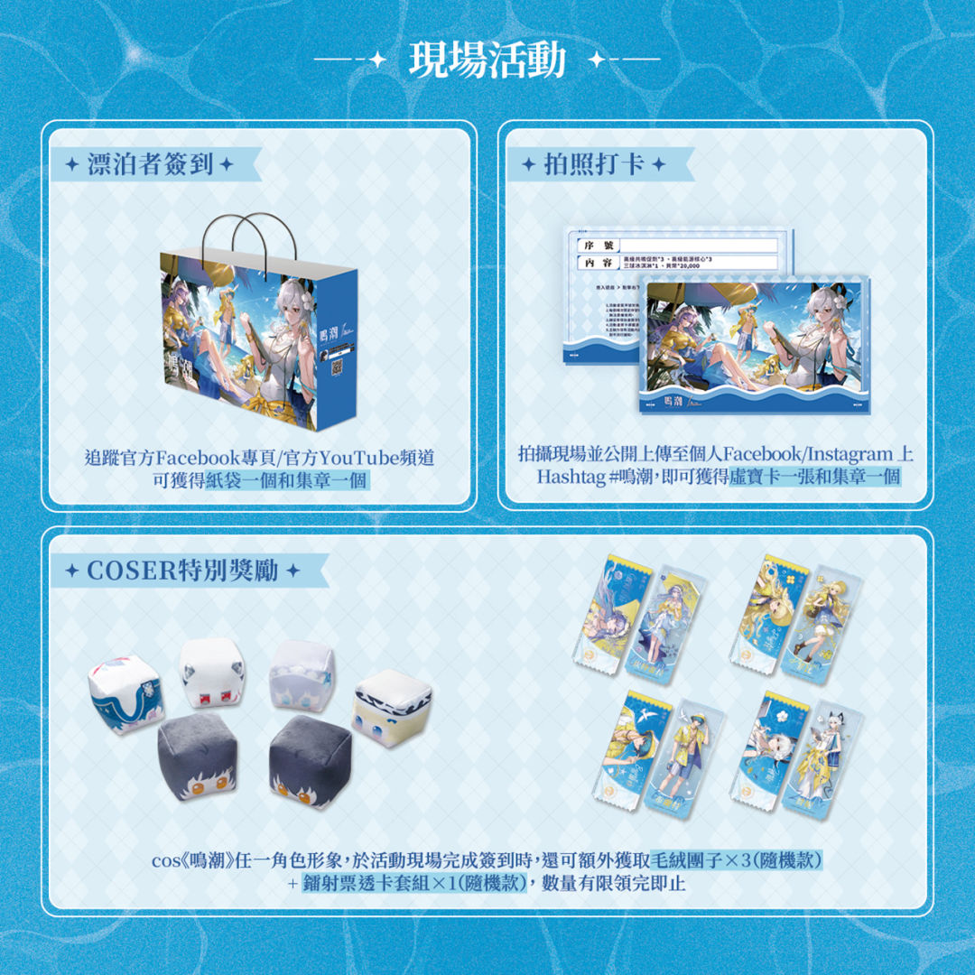 .於活動現場完成簽到動作,追蹤官方 Facebook 專頁/官方 YouTube 頻道,可獲得紙袋乙個和集章乙個。 .cos《鳴潮》任一角色形象,於活動現場完成簽到時,可額外獲得毛絨團子三個(隨機款)+鐳射票透卡乙組(隨機款)。 |