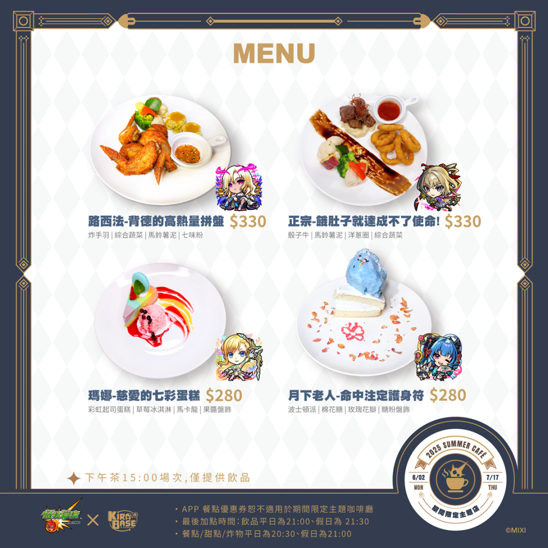 此次快閃活動推出全 10 款限定餐點:包含 2 道主餐(如「路西法-背德的高熱量拼盤」、「正宗-餓肚子就達成不了使命!」),2 款甜點(如「瑪娜-慈愛的七彩蛋糕」、「月下老人-命中注定護身符」),以及 6 款精緻飲品(含人氣角色久遠、奈特梅雅、基度山等造型飲品),讓來店顧客不僅能享用視覺與味覺兼具的創意美食,也能從中找尋屬於自己最愛角色的味道。