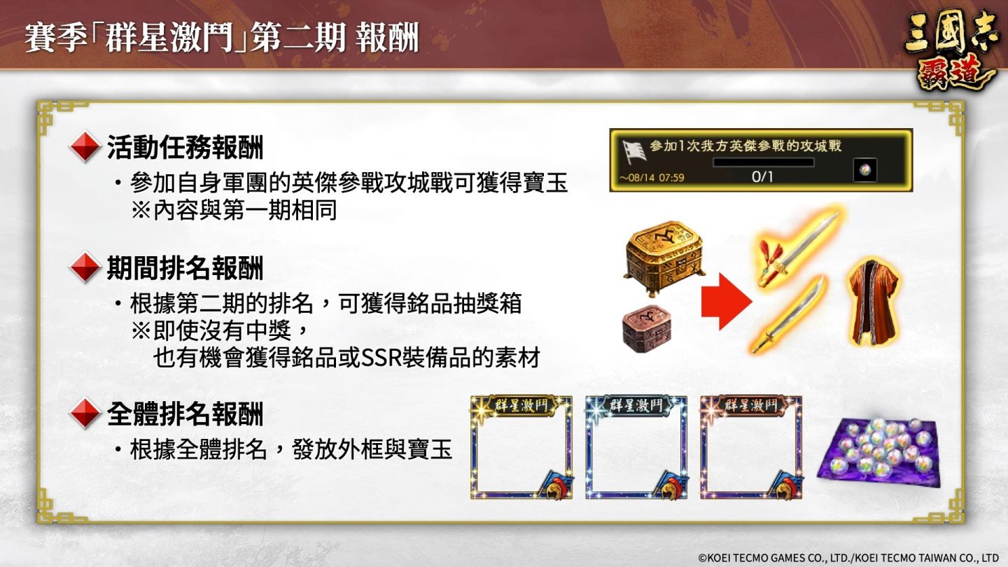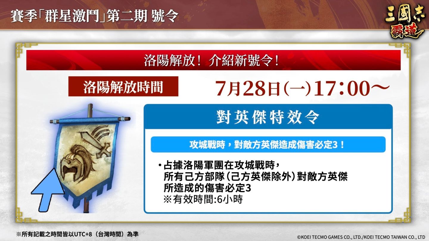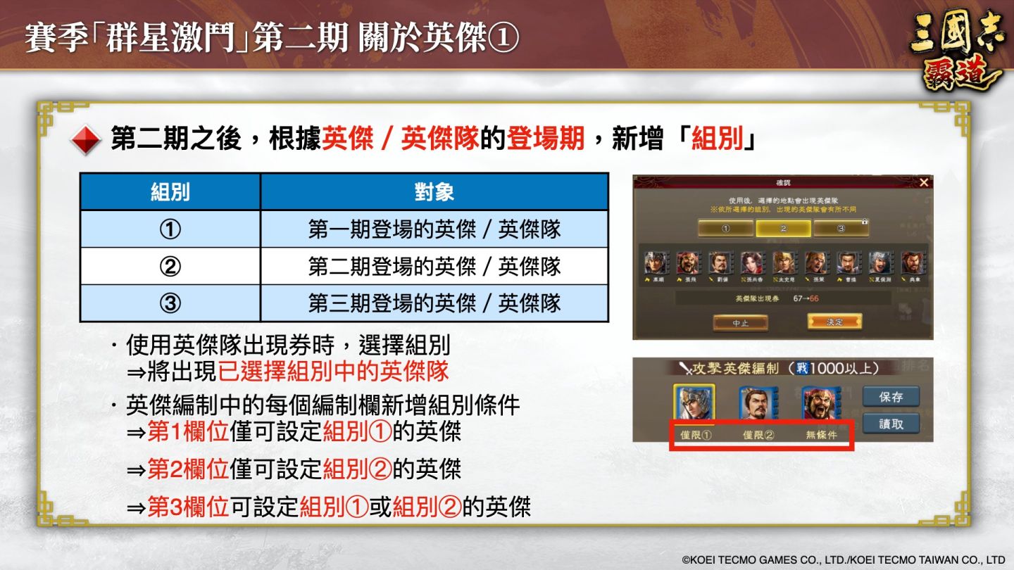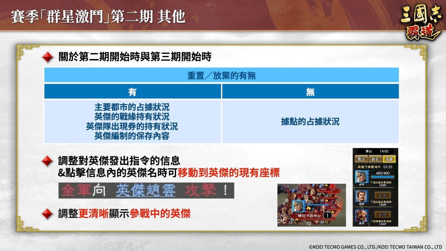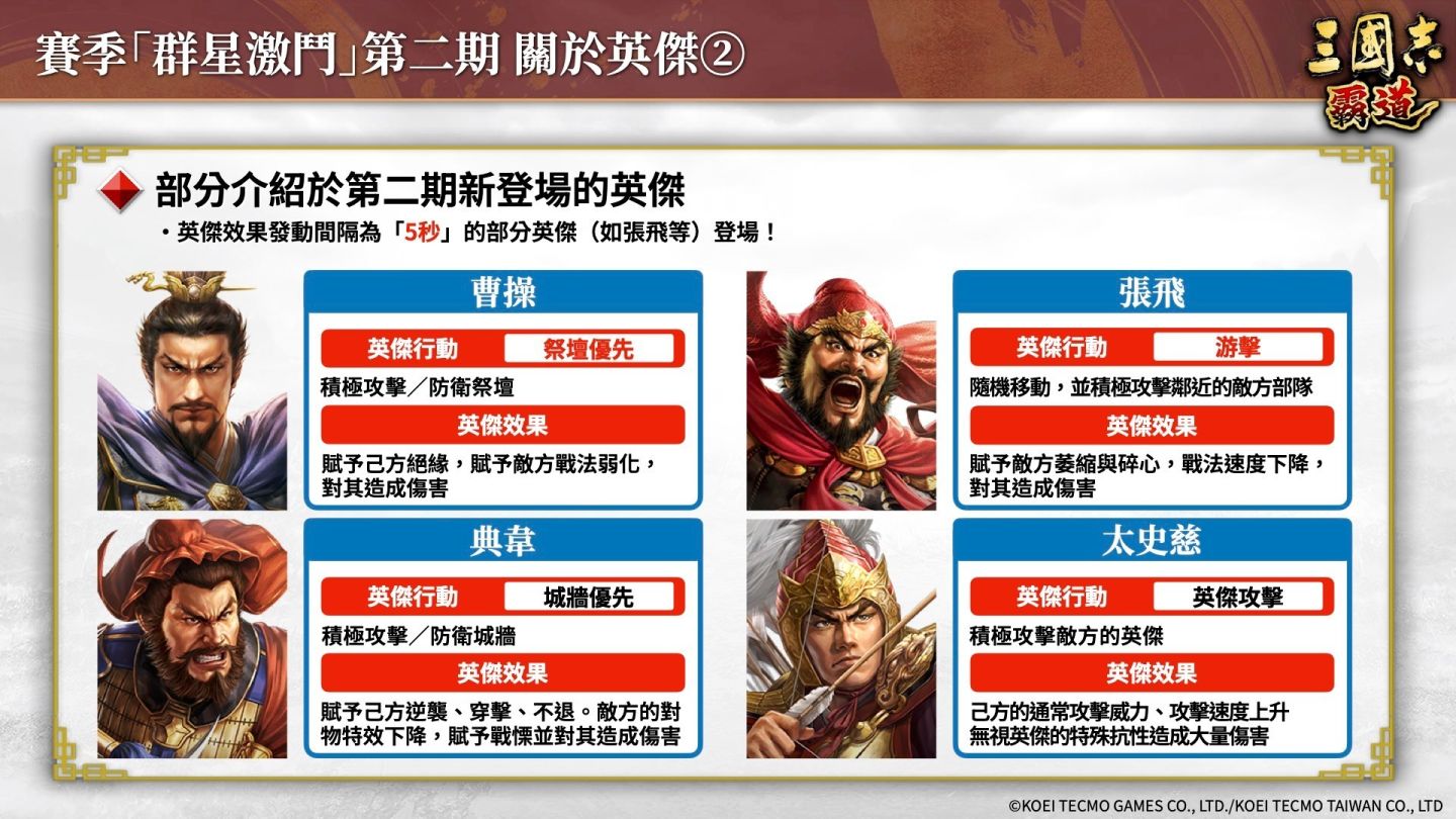 新賽季「群星激鬥」第二期已開戰,曹操、劉備等共 9 名英傑全新登場,和強力的英傑們一同問鼎軍團霸者的頂點吧!