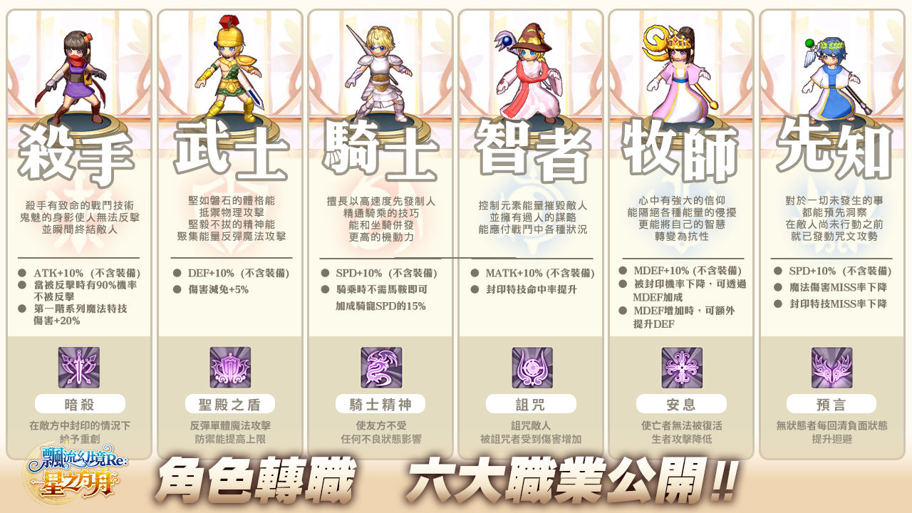 承襲系列作經典職業,《飄流幻境 Re:星之方舟》同樣劃分為「戰士系列」(含殺手、武士、騎士)與「法師系列」(含智者、牧師、先知)兩大職業系列。