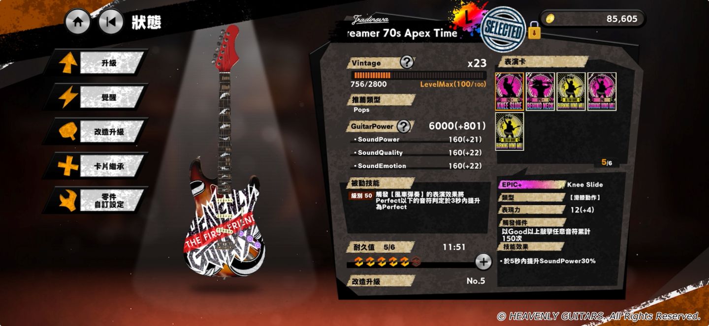 遊戲在主打吉他對戰的玩法以外,針對吉他有不同的效果,從藍調、龐克、搖滾曲風而定,為了吉他愛好者而開發,玩家在對戰時可以依據歌曲類型,選擇吉他與效果器讓演奏的節奏更加順暢。考慮到現實吉他愛好者都會將自己的吉他打扮一番,提供了吉他的客製化升級系統,讓高手玩家可以將自己的吉他鑄造為 NFT,讓粉絲去尋找收藏。搭配音色等元素,讓玩家理解到遊戲對吉他擬真的用心程度,目前已有專業吉他手錄製的 20 首原創樂曲,後續更新追加。