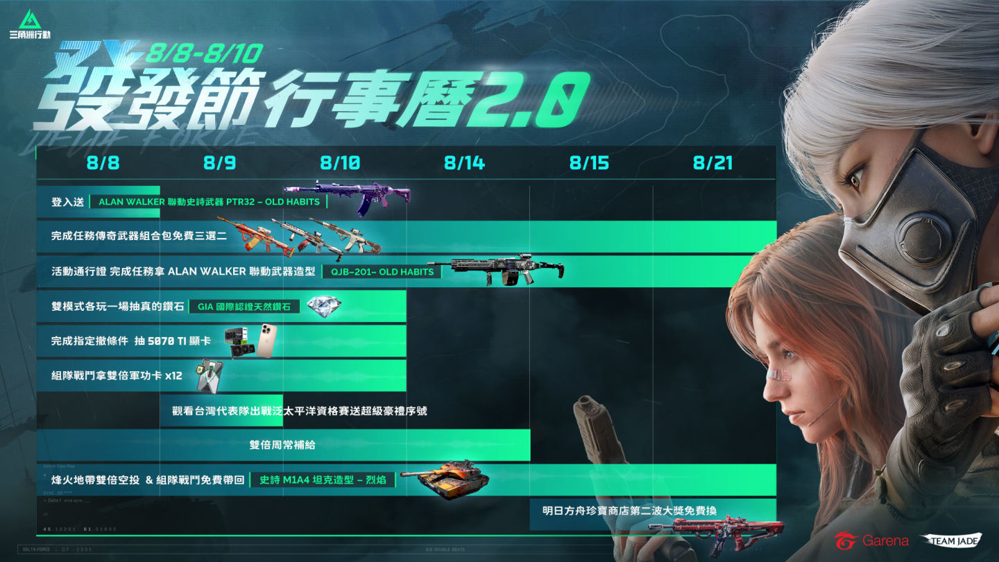 登入抽 GIA 國際認證天然鑽石及多項電競好禮,前往指定網咖再領虛寶及炸物點心。同時,為慶祝發發節的到來,8/8~8/10 也為台灣玩家準備了專屬活動: